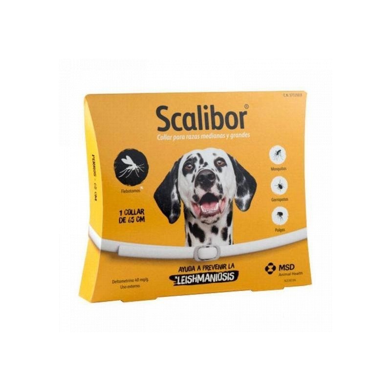Scalibor collar demuestra: - Efecto repelente (antialimentación) durante 12 meses para flebotomos (Phlebotomus perniciosus). - Efecto repelente durante 6 meses para mosquitos culícidos del complejo Culex pipiens. Scalibor collar previene de: - Infestaciones por garrapatas durante 6 meses - Infestaciones por pulgas durante 4 meses Se ha demostrado el efecto repelente de Scalibor frente a Phlebotomus perniciosus, vector de transmisión de Leishmania infantum. Por lo tanto, Scalibor se puede considerar como parte de un programa para la prevención de la infección por Leishmania infantum.