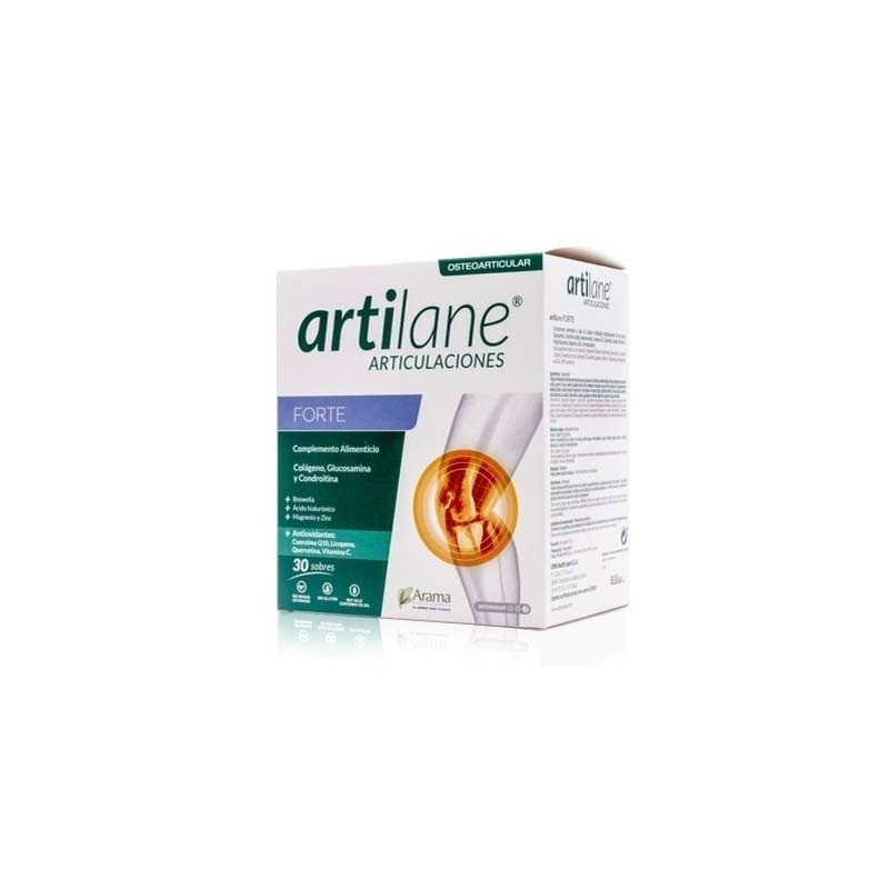 Artilane® Forte contiene altas dosis de Glucosamina y Condroitina, Colágeno hidrolizado enzimáticamente de alta pureza, Ácido hialurónico, Magnesio, Zinc, Boswelia y antioxidantes como Coenzima Q10 Licopeno, Quercetina y Vitamina C.