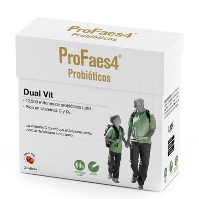 Los Fructooligosacáridos (prebióticos) aumentan el número de Bifidobacterias en el colon, además Profaes4 Dual-Vit, está compuesto con 12.500 millones de prebióticos Lab4, 50 mg de Vitamina C2 y Vitamina D3 que contribuyen al funcionamiento normal del sistema inmunitario. Es apto para adultos y niños a partir de 3 años.