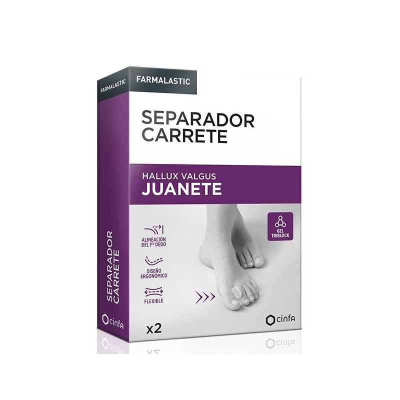 El Separador Carrete, para adultos, está indicado para personas que tienen juanete y dedos montados. Ayuda a alinear el primer dedo del pie evitando una superposición sobre los dedos contiguos. Evita la formación de rozaduras, callos y ampollas. El Separador Carrete del Gel Triblock está diseñado ergonómicamente para adaptarse al espacio entre el primer y segundo dedo del pie con facilidad. El gel es multidireccional, suave y flexible, eliminando la fricción entre los dedos al caminar. Cuenta con memoria de recuperación, vuelve a su forma inicial tras su uso. Se puede reutilizar. Apto para utilizar con calcetines, medias y calzado habitual.