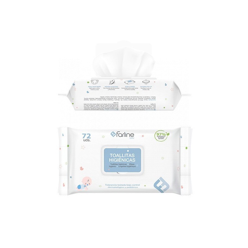 Toallitas higienicas para la limpieza de la piel del bebe, apto para culito, cara y manos. Aporta la máxima suavidad mientras limpia delicadaente y respeta la piel del bebé. A partir de 0 meses. Contiene un 97% de ingredientes de origen natural. Tolerancia testada bajo control pediátrico y dermatológico. Gracias a su doble cierre se mantiene la humedad adecuada hasta la última toallita y su sistema de pop-up facilita su uso en el día a día. Presentación: 72 toallitas y Triplo Ahorro 3x72 toallitas.